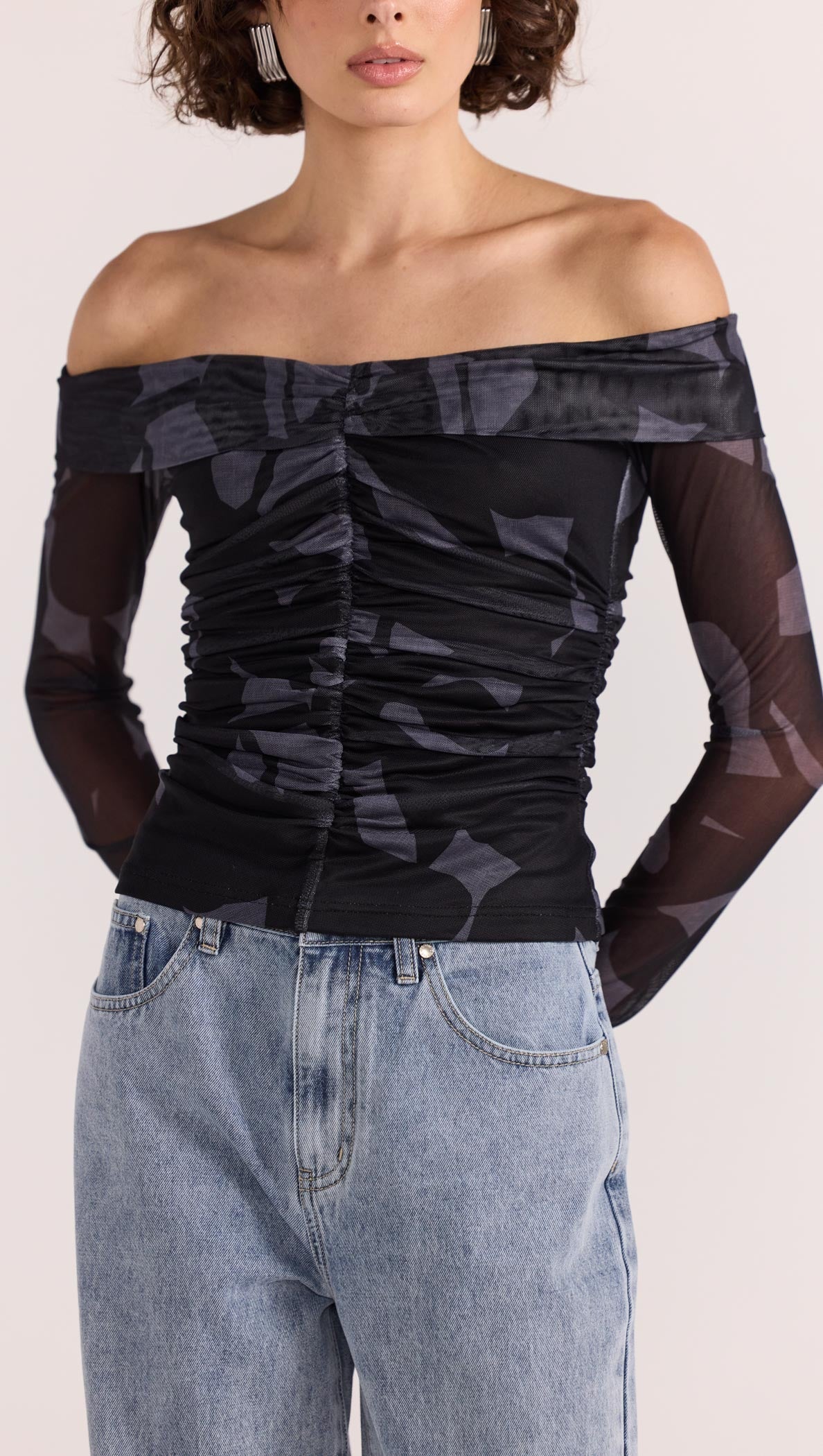 Aura Mesh Off Shoulder Top is a striking statement piece featuring an exclusive abstract print in a sheer stretch mesh. This top contours the body with ruched detailing through the centre front and sheer long sleeves for a modern edge. The off-shoulder neckline creates a flattering silhouette