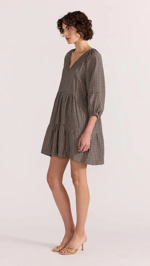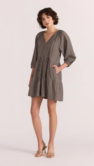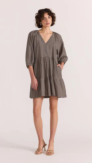 The Calla Tiered Mini Dress features a relaxed silhouette, and a muted geometric pattern. This print is exclusive to Staple the Label. Style with neutral mules or a knee high boot to complete the look.