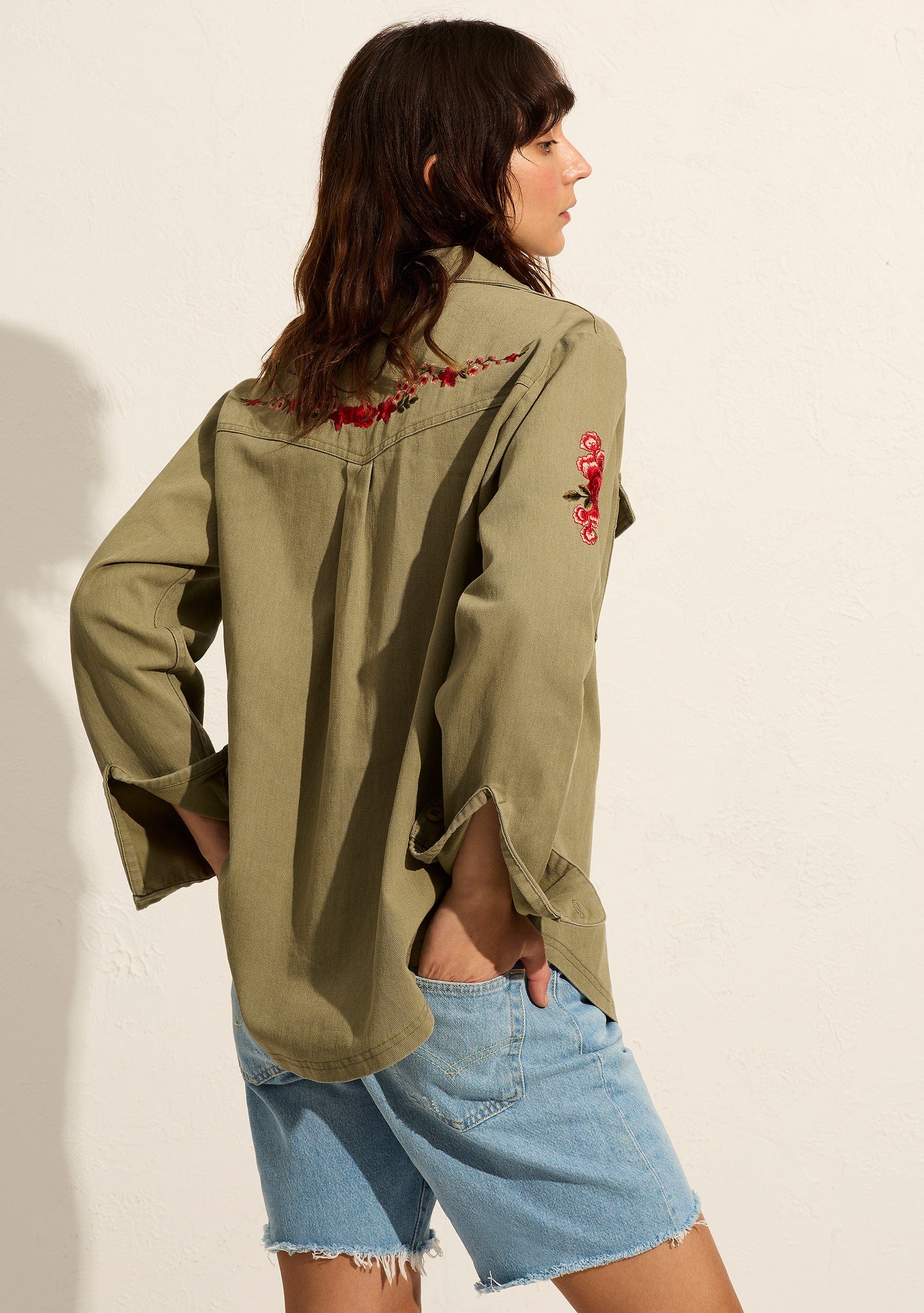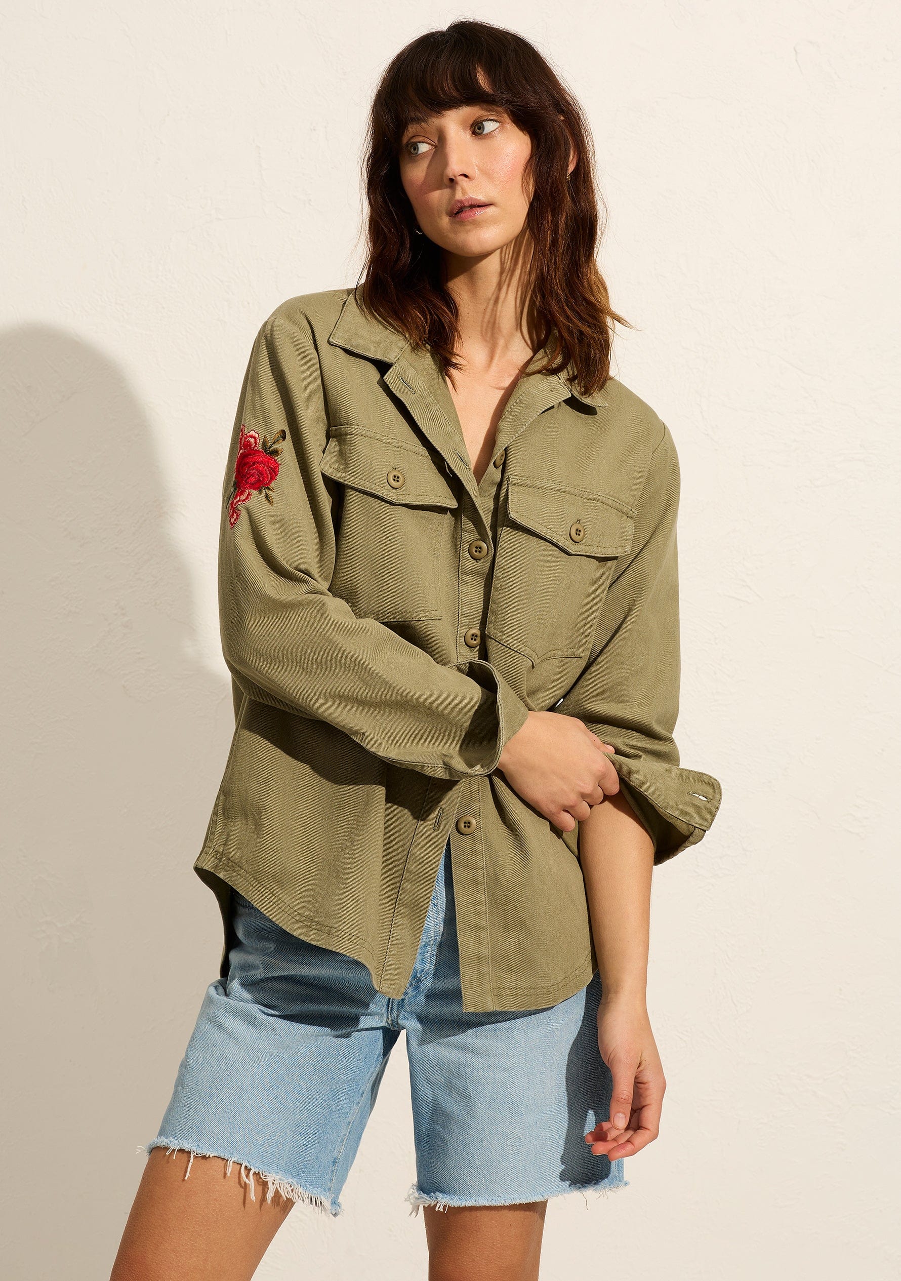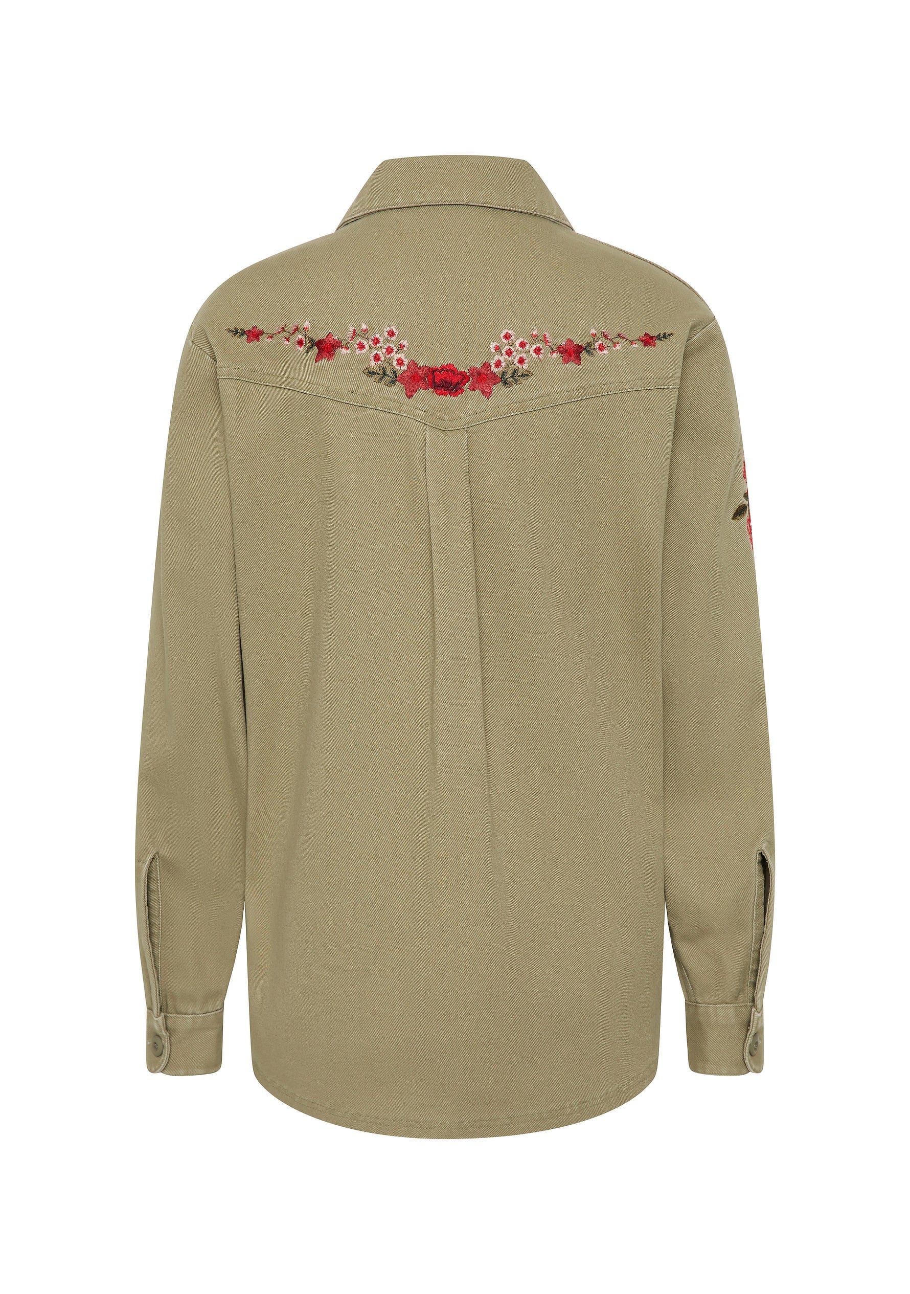 Effortlessly cool, the Oren Shirt in khaki features a classic collar, button-front closure, and front patch pockets. Floral embroidery accents the sleeves and back yoke, while the relaxed fit and soft recycled cotton twill make it an everyday essential.