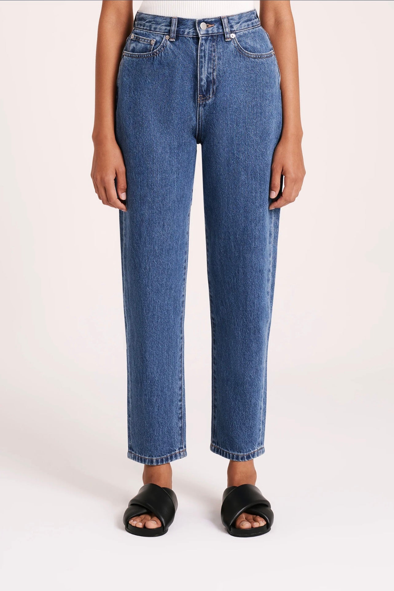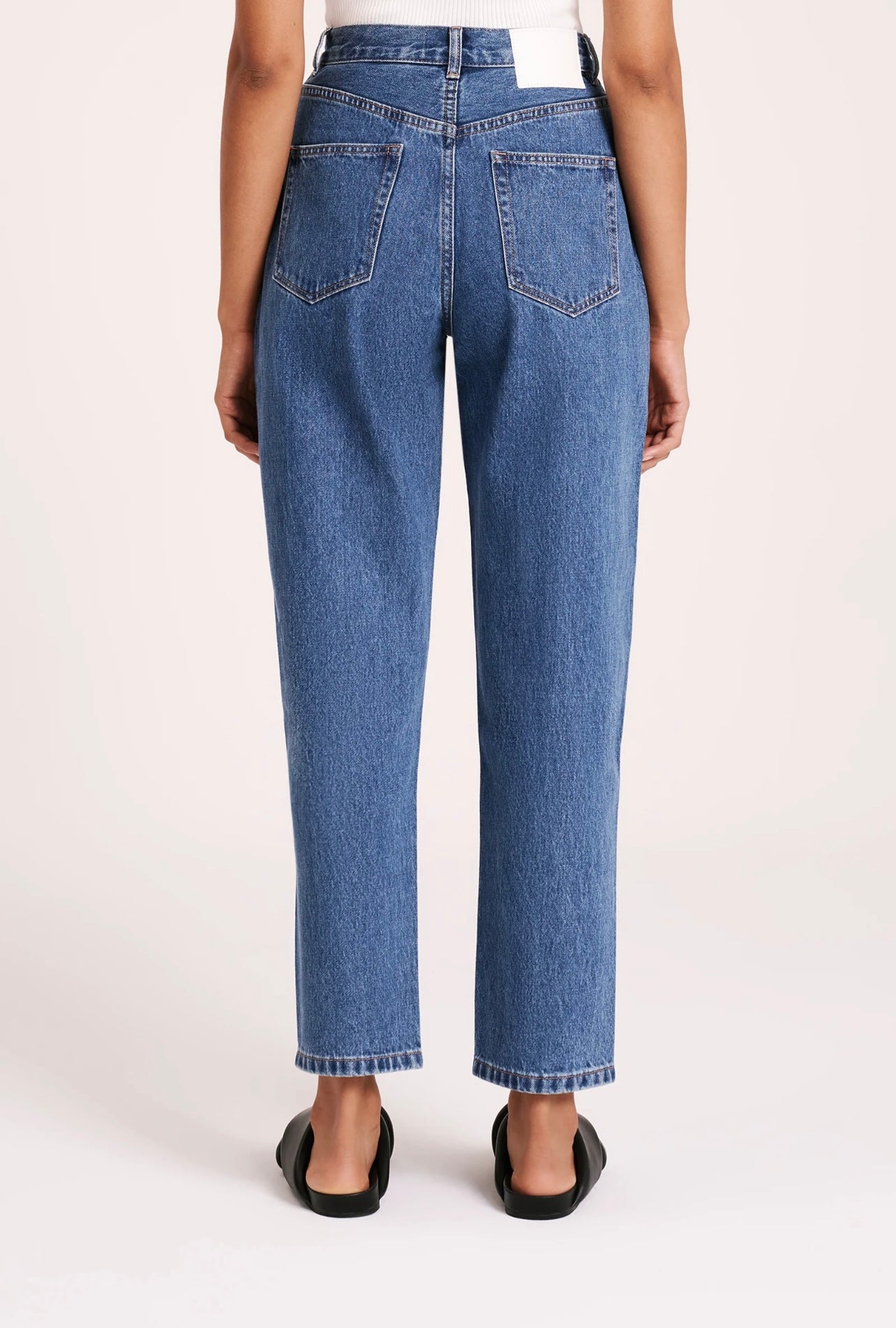 A classic Mom Jean made from 12 oz 100% organic cotton denim, stone washed to an authentic stone wash blue. Shape is a high rise & fitted waist with classic mom leg, relaxed through the thigh, tapering down at the ankle. Features include branded shank button, rivets & Jacron Back patch. Fits true to size, size up for a more relaxed fit.