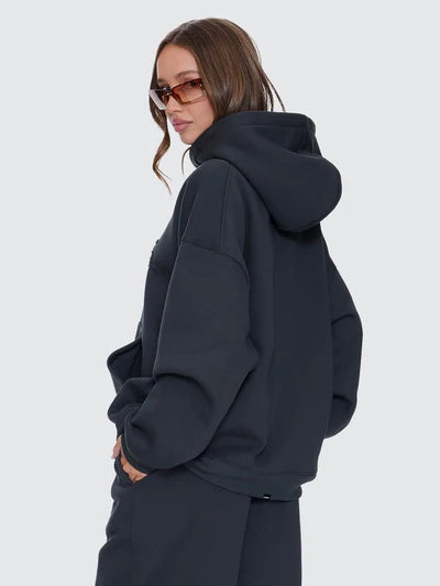Lock into comfort with attitude in the Playmaker Cocoon Panel Hood in Carbon. Cut oversized with a slouchy, effortless energy, this heavyweight hoodie for women hits different from the first wear. Brushed fleece brings serious warmth, while the cocoon panelling and front pouch keep the silhouette clean but street-ready. Finished with bold applique detailing, itÕs made for late nights, cold mornings, and everything in between. Match this women's hoodie with our Playmaker Track Pant for a full fit moment.